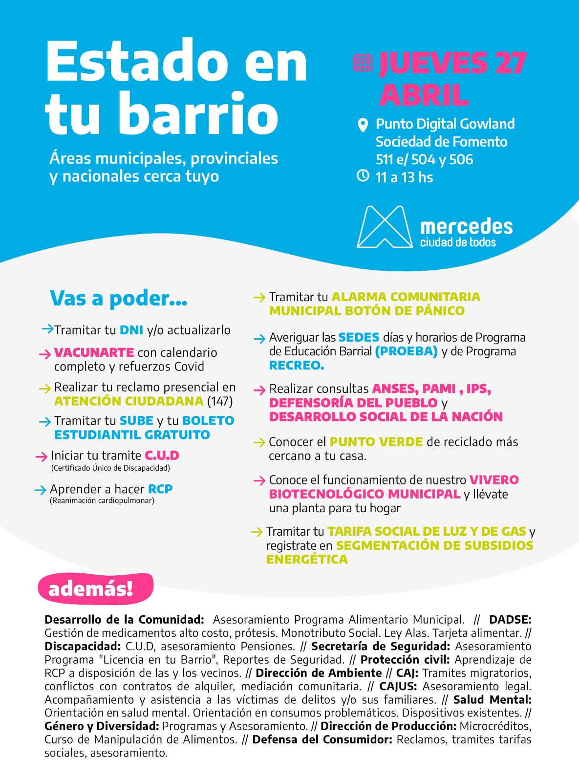 Este jueves de 11 a 13 horas en la sede fomentista de Gowland, calle 511 entre 504 y 506, los vecinos podrán acceder a diferentes trámites. Tramitar DNI, vacunarse, tramitar el boleto estudiantil y la SUBE, hacer la alarma comunitaria, iniciar el trámite del certificado de discapacidad, aprender a hacer RCP y conocer el vivero Biotecnológico.
