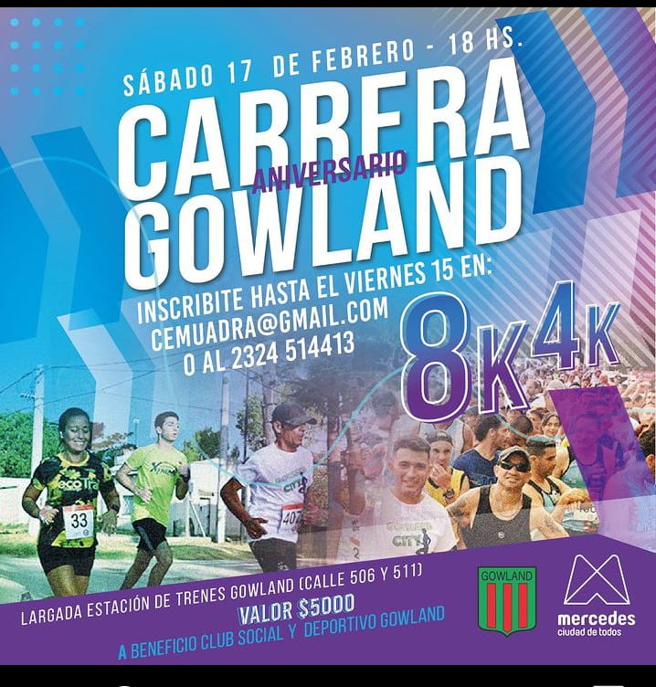 Los festejos fueron pasados para el sábado 17 donde se concretarán varias actividades. Por caso, se desarrollará en primera instancia la tradicional carrera aniversario a partir de las 18 horas. Para inscribirse hay tiempo hasta el viernes 15 y se puede realizar comunicándose al mail cemuadra@gmail.com o al teléfono2324514413. La inscripción tiene un valor de 5 mil pesos y es a beneficio del Club Social y Deportivo Gowland.