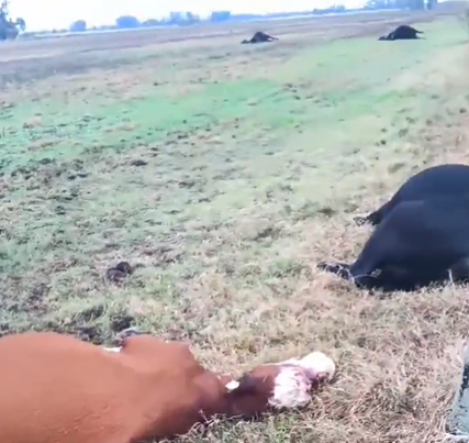 En Twitter, un usuario compartió el video donde se observa a 9 animales que murieron por un rayo en un establecimiento de Luján.